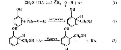 Поликонденсация формальдегида с фенолом является реакцией второго порядка. В среде с рН = 1—4 скорость реакции пропорциональна концентрации ионов Н+; при рН — 4—5 скорость реакции минимальна; при рН более 5 скорость реакции пропорциональна концентрации ионов ОН-. Эти факторы свидетельствуют о том, что реакции при разных значениях ' рН протекают по разным механизмам. Присоединение иона гидроксиметилкар-бония (I) к молекуле фенола [реакция (2)) происходит с наименьшей скоростью. Ниже приведены уравнения реакций, протекающих при образовании новолаков: