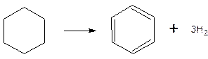Дегидрирование шестичленных нафтеновых углеводородов является основным направлением их превращения в условиях каталитического риформинга. Скорости дегидрирования шестичленных нафтеновых углеводородов на платиновых катализаторах риформинга велики и превышают скорость их дегидрирования на других металлических и оксидных катализаторах. Механизм реакции дегидрирования циклогексана включает последовательное отщепление двух атомов водорода с образованием адсорбированного циклогексена. Эта стадия является лимитирующей. Далее происходит отщепление одного за другим остальных четырех атомов водорода, в результате чего образуется бензол.