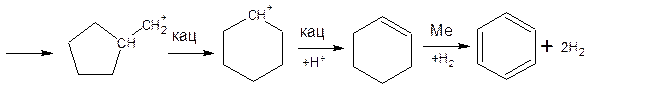 Наряду с реакциями С5- и С6- дегидроциклизации, катализируемыми платиной, протекают также реакции циклизации под действием кислотного центра катализатора. Образующиеся циклопентаны превращаются в ароматические углеводороды, подвергаясь дегидроизомеризации.