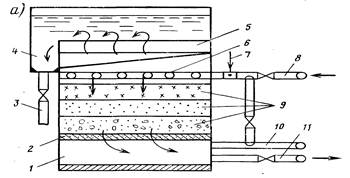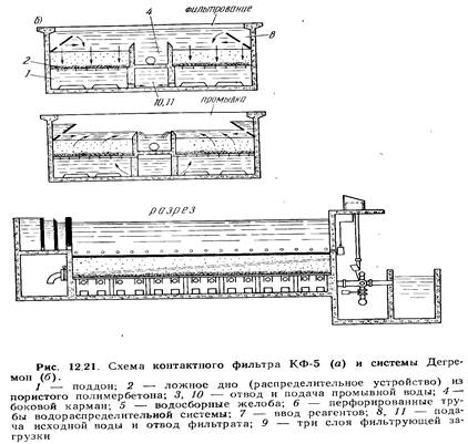 В системах муниципального, а также производственного водоснабжения нашел применение прямоточный открытый контактный фильтр КФ-5 (рис. 12.21, а) с трехслойной фильтрующей загрузкой (по 0,5 каждый). Верхний слой (керамзит, аглопорит, полимеры) имеет крупность зерен 2,3 . 3,3 мм; средний (антрацит, керамзит, горелые породы) — 1,25 . 2,3 мм; нижний (кварцевый или гранитный песок, горелые породы) — 0,8 . 1,25 мм. Скорость фильтрования до 20 м/ч, интенсивность промывки 15 л/(с-м2), продолжительность — 6 . 8 мин.