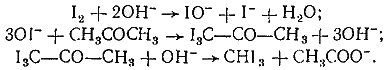 Количественное определение ацетона основано на образовании йодоформа при взаимодействии его со щелочным раствором: йода. Избыток йода после подкисдения оттитровывают 0,1 н. раствором тиосульфата натрия, индикатор – раствор крахмала.