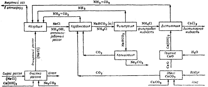 Описанные стадии можно показать в виде принципиальной схемы производства кальцинированной соды, которая и изображена на рис. 3.1.
