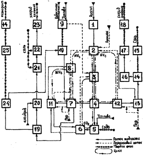 Образующийся парогазовый поток после охлаждения (VIII) поступает на абсорбцию (II), замыкая аммиачный цикл производства соды.