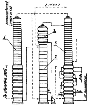 Отделение карбонизации (рис. 4.1) комплектуется сериями колонн, при этом производительность каждой серии равна производительности абсорбционной колонны. В состав серии входят осадительные карбоколонны 5, первый промыватель газа колонн 3 и теплообменник 2. Периодически каждую из осадительных колонн ставят на промывку, тогда она выполняет функцию колонны предварительной карбонизации 1. Карбонизационные колонны работают сериями, чтобы обеспечить непрерывность потока подаваемого в отделение фильтрации. Наибольшее распространение получили серии, состоящие из четырех карбонизационных колон, из которых три работают как осадительные, а одна – как колонна предварительной карбонизации.