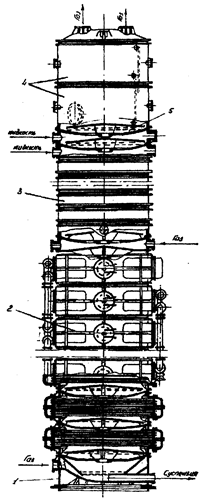 Рисунок 4.2 – Карбонизационная осадительная колонна: 1 – царга-база; 2 – холодильная царга; 3 – абсорбционная царга; 4 – сепарационные царги; 5 – пасетная барботажная тарелка.