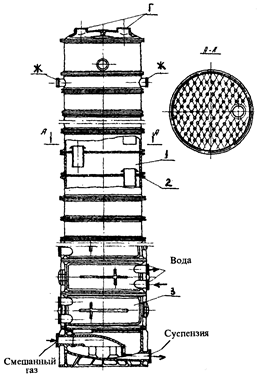 Рис. 4.3 – Карбонизационная колонна с перекрестно-точными тарелками: 1 – абсорбционная царга; 2 – перекрестно-точная тарелка; 3 – холодильная царга.