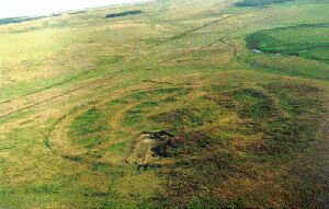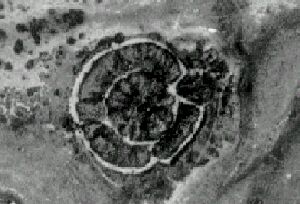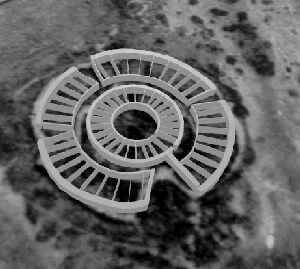 Рис.2 Аэрофотоснимок Аркаима. Аркаим являлся не только городом, но еще и храмом, и астрономической обсерваторией! Он имел форму круга, наружным диаметром около 160 метров. Окружал его 2-х метровый обводной ров, заполнявшийся водой. Внешняя стена очень массивная. При высоте 5,5 м она имела пятиметровую ширину. В стене были обозначены четыре входа. Самый большой – юго-западный, остальные три – поменьше, расположенные на противоположных сторонах. Войдя в город, мы попадаем на единственную кольцевую улицу, шириной около 5 метров, отделявшую примыкающие к внешней стене жилища от внутреннего кольца стен. Улица имела бревенчатый настил, под которым, по всей её длине была вырыта 2-х метровая канава, сообщающаяся с внешним обводным рвом. Таким образом, город имел ливневую канализацию – излишки воды, просачиваясь сквозь бревенчатую мостовую, попадали в канаву и затем во внешний обводной ров. Все жилища, примыкавшие к внешней стене, как дольки лимона, имели выходы на главную улицу. Всего жилищ внешнего круга было обнаружено 35. Далее, мы видим загадочное кольцо внутренней стены. Она была ещё массивнее внешней. При ширине 3 метра она достигала 7-ми метровой высоты. Эта стена, по данным раскопок не имеет прохода, кроме небольшого перерыва на юго-востоке. Таким образом, 25 внутренних жилищ, идентичных жилищам внешнего круга, становятся практически изолированными от всех высокой и толстой стеной. Чтобы подойти к маленькому входу во внутреннее кольцо, нужно было пройти по всей длине кольцевой улицы. Это преследовало не только оборонительную цель, но и имело скрытый смысл. Входящему в город нужно было пройти путь, который проходит Солнце. По всей видимости, в хорошо защищённом внутреннем круге находились те, кто обладал чем-то, что не следовало показывать даже своим, живущим во внешнем круге, не говоря уже о внешних наблюдателях.