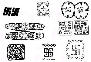 Рис.4 Сходства орнаментов свастики в древнерусских и индийских народных мотивах. Любопытные факты: Свастика (санаскр. – “связанная с благом”, “лучшая удача”) – один из наиболее архаичных сакральных символов, встречающийся уже в верхнем палеолите у многих народов мира. Индия, древняя Русь, Китай, Египет и даже государство загадочных Майя в центральной Америке – вот неполная география этого символа. Свастику можно видеть на старых православных иконах. Свастика – символ Солнца, удачи, счастья, созидания (“правильная” свастика). И, соответственно, свастика противоположного направления символизирует тьму, разрушение, “ночное Солнце” у древних русичей. Как видно из древних орнаментов, в частности на арийских кувшинах, найденных в окрестностях Аркаима, применялись обе свастики. Это имеет глубокий смысл. День сменяет ночь, свет сменяет тьму, новое рождение сменяет смерть– и это естественный порядок вещей во Вселенной. Поэтому, в древности не было “плохих” и “хороших” свастик – они воспринимались в единстве. (как “Инь” и “Янь”, например). Кстати, фашисты взяли на вооружение своей ошибочной идеологии “обратную” свастику – символ разрушения. Каждый новый этап раскопок преподносил очередную сенсацию. Удивлению археологов не было предела. Это и лабиринты – ловушки у входов в Аркаим, это и множество переходов внутри внешней стены. По крышам жилищ проходила верхняя улица, по которой можно было ездить на колесницах!