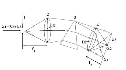 щель; 2 - объектив коллиматора (D1-его диаметр, f1-фокусное расстояние); 3 - призма;