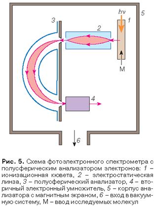 Энергоанализатор электронов – центральная часть любого электронного спектрометра. В первых экспериментальных установках были использованы светосильные и простые в изготовлении цилиндрические коаксиальные анализаторы с задерживающим электростатическим полем. Но разрешающая сила таких анализаторов сравнительно низкая (Е / ΔE < 200). В большинстве современных серийных спектрометров высокая разрешающая сила энергоанализаторов (Е / ΔE ~ 104-105) достигается пропусканием электронов через диспергирующее электростатическое поле, в котором отклонение является функцией энергии электрона. В приведенной на рис. 5 схеме отечественного анализатора отклоняющее поле создается между двумя концентрическими полусферами. Для записи всего спектра ступенчато изменяется потенциал между обкладками конденсатора либо между выходной щелью ионизационной кюветы и входной щелью анализатора.