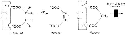 Если в среду добавить малонат (ингибитор), то в результате структурного сходства его с истинным субстратом сукцинатом (наличие двух таких же ионизированных карбоксильных групп) он будет взаимодействовать с активным центром с образованием фермент-ингибиторного комплекса, однако при этом полностью исключается перенос атома водорода от малоната. Структуры субстрата (сукцинат) и ингибитора (малонат) все же несколько различаются. Поэтому они конкурируют за связывание с активным центром, и степень торможения будет определяться соотношением концентраций малоната и сукцината, а не абсолютной концентрацией ингибитора. Таким образом, ингибитор может обратимо связываться с ферментом, образуя фермент-ингибиторный комплекс. Этот тип ингибирования иногда называют ингибированием по типу метаболического антагонизма.