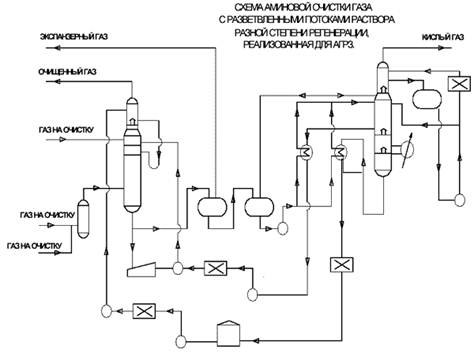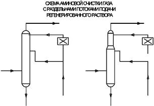 В схеме аминов и очистки газа с высоким содержанием кислых компонентов подача раствора в абсорбер осуществляется двумя потоками, но разной степени регенерации. Частично регенерированный раствор из десорбера подается в среднюю секцию абсорбера. Глубокой регенерации подвергается только часть раствора, которая подается на верх абсорбера для обеспечения тонкой очистки газа. Такая схема позволяет по сравнению с обычной схемой до 10-15% снизить расход пара на регенерацию раствора.