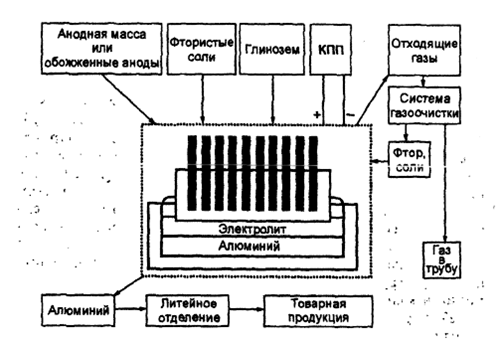 Рис. 2.1. Схема производства алюминия из глинозема.