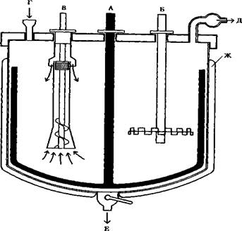 Рис. 1. Котел с кожухом, в котором находятся приспособления для изготовления гелей: А - стержневой смеситель, Б - малая мешалка, В - гомогенизатор, Г - отверстие для заполнения, Д - отвод к вакуумному насосу, Е - отверстие для спуска, Ж - водяной кожух