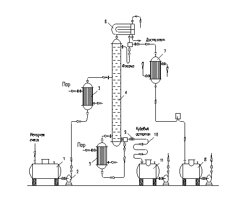 Из кубовой части колонны насосом-9 непрерывно выводится кубовая жидкость – продукт, обогащенный труднолетучим компонентом, который охлаждается в теплообменнике-10 и направляется в емкость-11.