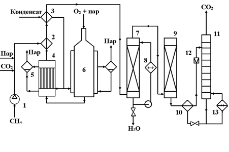 Наверх газ поступает в абсорбер 9, где поглощается CO2, а очищенный газ направляется к потребителю. Насыщенный абсорбент подогревается в теплообменнике 10 горячим регенерированным раствором и направляется в десорбер 11, с низа которого абсорбент направляется через т/о 10 вновь на поглощение CO2 в абсорбер 9. CO2 с верха 11 компримируют до соответствующего давления и возвращают на конверсию, смешивая перед т/о 2 с природным газом и водяным паром.
