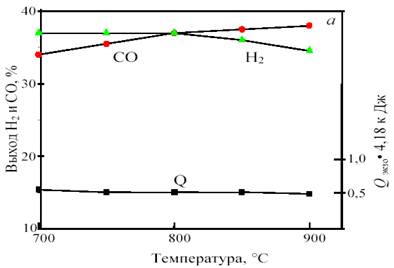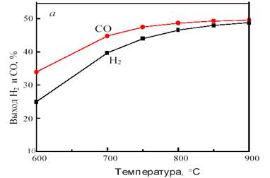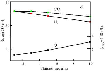 Изменение соотношения исходных компонентов позволяет получить газ состава 1СО:1Н2 с одновременным сохранением термонейтральности. Например, исходная смесь, содержащая 38% СН4, 43% СО2 и 19% СО2, при 800 °С и 1 атм. дает продукт состава 36,0% Н2 и 36,4% СО при нулевом тепловом эффекте. При повышении температуры получается избыток СО: при 900 °С ─ 34,6% Н2 и 38,0% СО, а при снижении температуры ─ избыток Н2: при 700 °С ─ 36,4% Н2 и 33,6% СО. В качестве примера на рис. 13 показана зависимость равновесного выхода СО и Н2 от температуры и давления для исходной смеси 38 % CH4 + 43% CO2 + 19% O2.