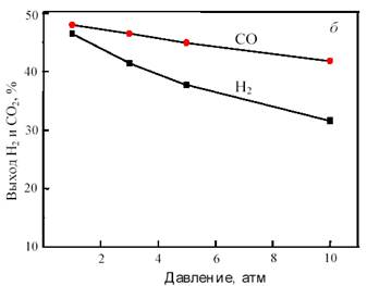 Рис. 11. Зависимость равновесного выхода Н2 и СО от температуры при 0,1 МПа (а) и от давления при 800 °С (б) в исходной смеси 1СН4:1СО2