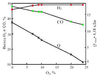Рис. 12. Зависимость равновесного выхода Н2 и СО и теплового эффекта реакции (теплопоглощения) Qэндо при 800 °С и 0,1 МПа от содержания кислорода (x) в смеси 50% СН4 + (50-х)% СО2 + х% О2