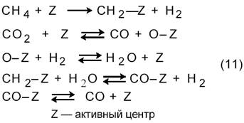 Первой работой по кинетике углекислотной конверсии метана (3) была работа, выполненная в лаборатории М.И. Темкина [11]. Основываясь на схеме