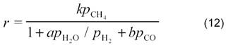 где k, a и b ─ константы; ρСН4, ρН2О, ρН2 и ρСО ─ парциальные давления метана, воды, водорода и СО, соответственно.
