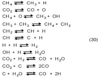 Квантово-механический расчет реакции СО2+СН4 на Cu(111), Ni(111), Pd(111), Pt(111), Rh(111), Ru(111), Ir(111) и Fe(111) методом UBI─QEP (unity bond index ─ quantum exponential potential) [18] показал, что лимитирующими стадиями являются как диссоциация СН4, так и диссоциация СО2, причем оба процесса ускоряют друг друга. Рассмотрев 84 возможных реакции на поверхности, авторы пришли к следующей более вероятной схеме: