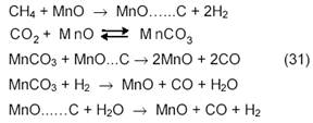 2) диссоциация СН4 и взаимодействие фрагментов С или СHx с СО2 или с СО32─ на металлах, нанесенных на основные носители. В последнем случае взаимодействие облегчается в присутствии добавок оксидов переходных металлов, участвующих в восстановлении CO2.