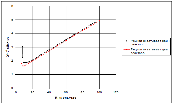 По графику видно, что энергетически более выгодная схема с охватом рециклом двух реакторов, т. к. при фиксированной величине рецикла в ней энергозатраты меньше по сравнению со схемой с охватом рециклом одного реактора. И оптимальная величина рецикла требует меньших энергетических затрат в системе с подачей рецикла на вход первого реактора. Например, при фиксированной величине рецикла R=10 кмоль/час, энергозатраты в системе с охватом рециклом двух реакторов Q=1,60514*107кДж/час, а в системе с охватом рециклом одного реактора Q=186636*107кДж/час.