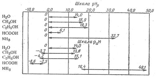 Рис. 1. Шкала рНр и шкала раН в различных растворителях.
