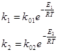В этом уравнении от температуры зависит константа скорости, чем выше температура, тем больше константа. Так что, чем выше температура, тем больше начальная скорость реакции, и начинать реакцию надо с максимально возможной температуры. Но как только реакция началась, появляется продукт реакции, и анализировать нужно уравнение скорости целиком. Теперь температура влияет на константу скорости прямой реакции, тем самым увеличивая скорость образования продукта, но одновременно увеличение температуры увеличивает константу скорости обратной реакции, что уменьшает скорость образования продукта. В этой ситуации надо понять, на какую из этих констант температура влияет сильнее. К примеру, если мы найдем, что температура влияет сильнее на константу скорости прямой реакции, то понижение температуры сильнее уменьшит константу скорости прямой реакции, и скорость образования продукта уменьшится. И наоборот. Константа скорости увеличивается с ростом температуры по уравнению Аррениуса, запишем это уравнение для обеих рассматриваемых констант.