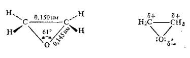 Эпоксидная группировка полярна и имеет дипольный момент m=6,28 10 -30 Кл м (1,88 D). Причинами этого являются полярность связей С—О и небольшой угол СОС, тогда как в обычных простых эфирах угол СОС равен 109 - 1120 и m==4-10-30 .4,3-10-30 Кл м (1,2. . .1,3D).