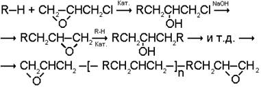 (Кат.- катализатор, в качестве которого используют основания, кислоты, соли металлов: n=0-3). Если реакцию проводят в присутствии кислот, то на концах молекул остаются хлоргидриновые группы; поэтому для осуществления дегидрохлорирования добавляют щёлочь.