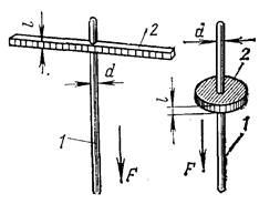 Рис. 17. Образцы для определения сдвиговой адгезионной прочности в соединениях полимеров с волокнами: 1 - волокно диаметром d; 2 - слой полимер толщиной l