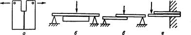 а — внецентренное растяжение для блочных материалов; б — изгиб для плиточного и листового материалов; в — изгиб для листового материала; а—консольный изгиб.
