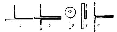 Рис. 2. Схемы испытаний по отслаиванию гибких материалов от жесткой подложки под углом 90° (а, б, в) и 180° (г) и по расслаиванию гибких материалов (д).