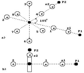 На рис. 2 показана структура молекулы воды, следующая из структур ядер атомов кислорода и водорода. Два электрона 1 и 2 атома кислорода расположены на оси атома, а шесть остальных – по кругу, перпендикулярному оси.