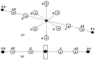 b) линейная схема 1,2,3,4,5,6,7,8 - номера электронов атома кислорода;