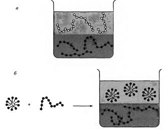 Рис. 1. Вследствие больших мицеллярных (молекулярных) масс мицелл можно ожидать, что в отсутствие значительных сил притяжения смешанный раствор полимера и поверхностно-активного вещества будет проявлять типичную для полимеров несовместимость (а), т. е. разделение на две жидкие фазы: обогащенную полимером и мицеллярный раствор (б)