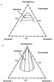 Рис. 2. Тройные фазовые диаграммы для двух полимеров в одном растворителе, показаны области сегрегации и ассоциации. В двухфазных областях приведены конноды, чтобы показать составы сосуществующих жидких фаз (растворов)