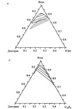 Рис. 3. Фазовые диаграммы (а) водных смесей декстрана (молекулярная масса 23000) и поли (этиленгликоля) (молекулярная масса 2300 (пунктирные линии) и 18000 (сплошные линии)) в сравнении с диаграмами (б) смеси декстрана (молекулярная масса 40000) и С12Е5. Выше кривых расположены зоны смешиваемости, под кривыми системы разделяются на две жидкие фазы (два раствора), (a)