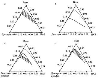 На рис. 2 сравниваются смеси полимер-ПАВ (декстран и неионное полиоксиэтилированное ПАВ) и полимер-полимер (декстран и поли (этиленгликоль)). Видно, что разделение на фазы в обоих случаях качественно одинаково.