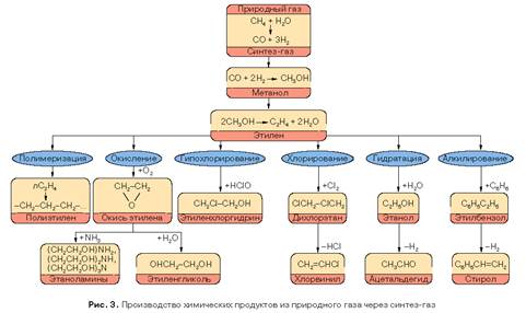 Ведутся исследования по разработке технологии производства метанола, которая позволит многие важнейшие продукты, производимые из нефтяного бензина через этилен (рис. 1), получать непосредственно из синтез-газа или через метанол (рис. 2, 3). Это открывает возможность развития промышленности органического синтеза на основе альтернативного нефти сырья - угля и природного газа. Такая возможность существовала и раньше, поскольку процессы газификации угля и конверсии метана в синтез-газ давно применяются в промышленной химии. Однако низкий уровень техники и технологии ограничивал это направление химического превращения угля и природного газа лишь производством аммиака и метанола.