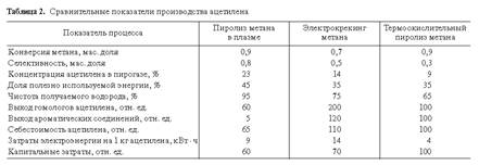 Ацетилен можно получать из природного газа по разным технологическим схемам, отличающимся способом активации системы (подвода энергии) и конструкцией реактора. Очевидно, что различные технологические процессы, используемые для получения одного и того же продукта, будут отличаться своими показателями (табл. 2).