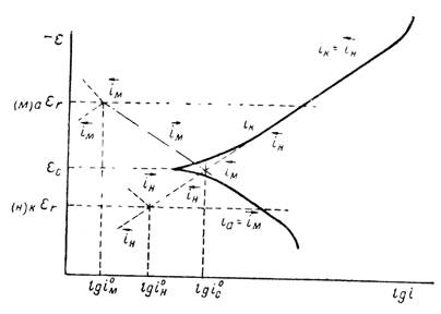 . Такое соотношение скоростей сохраняется до тех пор, пока не будут достигнуты соответствующие равновесные потенциалы. В этом случае частные токи для каждого из двух процессов сделаются равными соответствующим токам обмена i0М и i0H. Продолжение катодной и анодной поляризационных кривых от стационарного потенциала до обратимых потенциалов электродных реакций показано на рисунке 4 штрихпунктирными прямыми. Скорость коррозии является функцией тока обмена катодной и анодной реакций. С увеличением тока обмена (при тех же равновесных потенциалах) скорость коррозии растет. Скорость коррозии должна меняться параллельно с изменением коэффициента переноса α. Таким образом, коррозионная диаграмма позволяет связать скорость коррозии с основными кинетическими параметрами лежащих в ее основе электродных реакций. Эту связь можно выразить и аналитически. При стационарном потенциале скорость коррозии должна быть равна скорости растворения металла и в то же время скорости катодной реакции; в рассматриваемом случае - скорости катодного выделения водорода. На этом основании можно написать следующее уравнение 10: