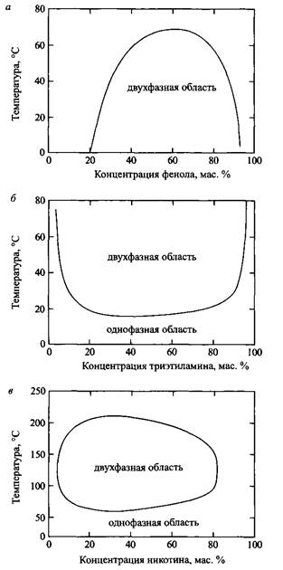 Рис. 3. Фазовые диаграммы смесей с верхними и нижними критическими точками: а — фенол-вода; б — триэтиламин-вода; в — никотин-вода
