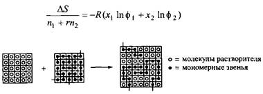 Общее число молей определяется как число молей растворителя и полимерных сегментов в системе. Энтропия смешения, отнесенная к одному молю вещества, задается выражением