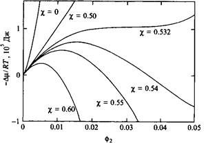 Рис. 5. Избыточный химический потенциал растворителя в бинарном растворе, содержащем полимер. Степень полимеризации составляет 1000, значения параметра взаимодействия ч указаны около кривых
