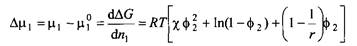Из уравнений и свободную энергию смешения на моль можно выразить уравнением, где первый член представляет собой изменение энергии, а второй — изменение энтропии при смешении. Производная этого выражения по компоненту 1 соответствует химическому потенциалу растворителя в бинарном растворе: