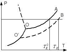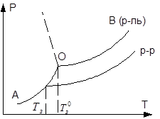 - моляльность, Е – эбуллиоскопическая константа, ОА – зависимость Р от Т для чистого растворителя, O’B– для раствора. Эбуллиоскопическая константа = повышению температуры кипения раствора в котором концентрация растворённого вещества = 1 моль/кг растворителя. При условии, что раствор сохраняет свойства разбавленного. Эбулеоскопической константой называется молярное повышение Т кипения. Е как и К зависит только от природы растворителя
