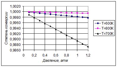 Рассчитаем зависимость равновесной степени конверсии от степени разбавления водой – инертным разбавителем при 800К, 700К, 600К и пониженном давлении 0,5атм. Результаты расчетов приведены в таблице.